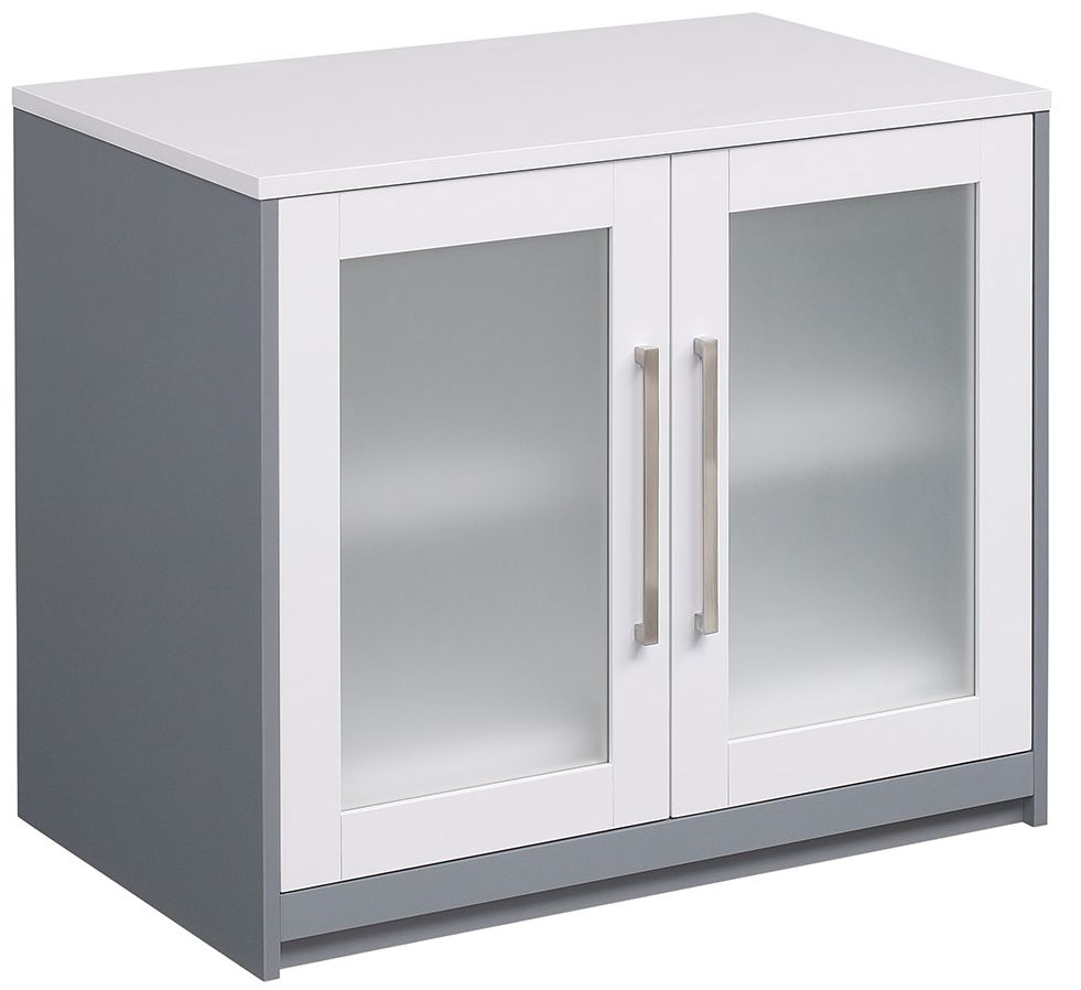 Add some extra room to organize in your home with this Pure Gray storage cabinet, featuring a High Gloss White top and doors, decorated with Dark Brushed Nickel handles. The multipurpose cabinet features glass-front double doors. The adjustable shelf and sliding bottom shelf are perfect for printers, office supplies and items needing storage in any room in the home. The flat side panels easily allow this piece to be arranged with other Ashford collection pieces to create your ideal home office or furnish any room.