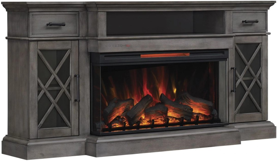The three-sided glass display of this ClassicFlame® electric fireplace offers a brilliant view of dancing 3D flame effects that will make friends and family feel like there’s nowhere they’d rather be. Accommodating your flat screen TV up to 80" and 155 lbs., this TV stand also includes two drawers and two side cabinets with adjustable shelves. The 5,200 BTU fireplace provides supplemental zone heating for rooms up to 1,000 square feet, helping you save money. The infrared quartz heat helps maintain the natural humidity with the air, for a more comfortable heat.