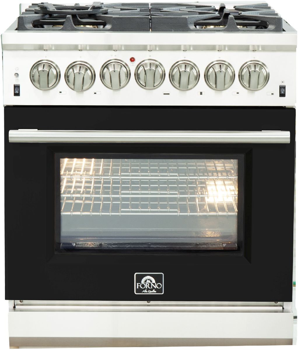 The Forno 30 Inch Capriasca Dual Fuel Range brings professional styling and Performance into your home kitchen with its durable and beautiful 304 grade stainless-steel design. Cooking surface has 5 sealed dual-ring brass burners with a total output of 100,000 BTU. 20K dual-ring burner for boiling or searing and is able to perform simmering like melting chocolate or sauces, Continuous heavy-duty cast-iron grates allow for easily sliding pots or pans off heat when desired. This 4.32 cu. ft. true convection fan oven has an impressive blue enamel interior, allowing for easy cleaning. The 3-layer glass oven door window provides both heat retention and an unobstructed view. This oven also boasts a total output of 6,300 Watts, providing plenty of power for baking, roasting, and broiling. Included are 3 fully telescopic easy access stainless steel oven racks, concave Wok Ring and LP conversion kit. Additionally, zinc coated metal knobs with bezel rings will maintain their beauty for years.Read More