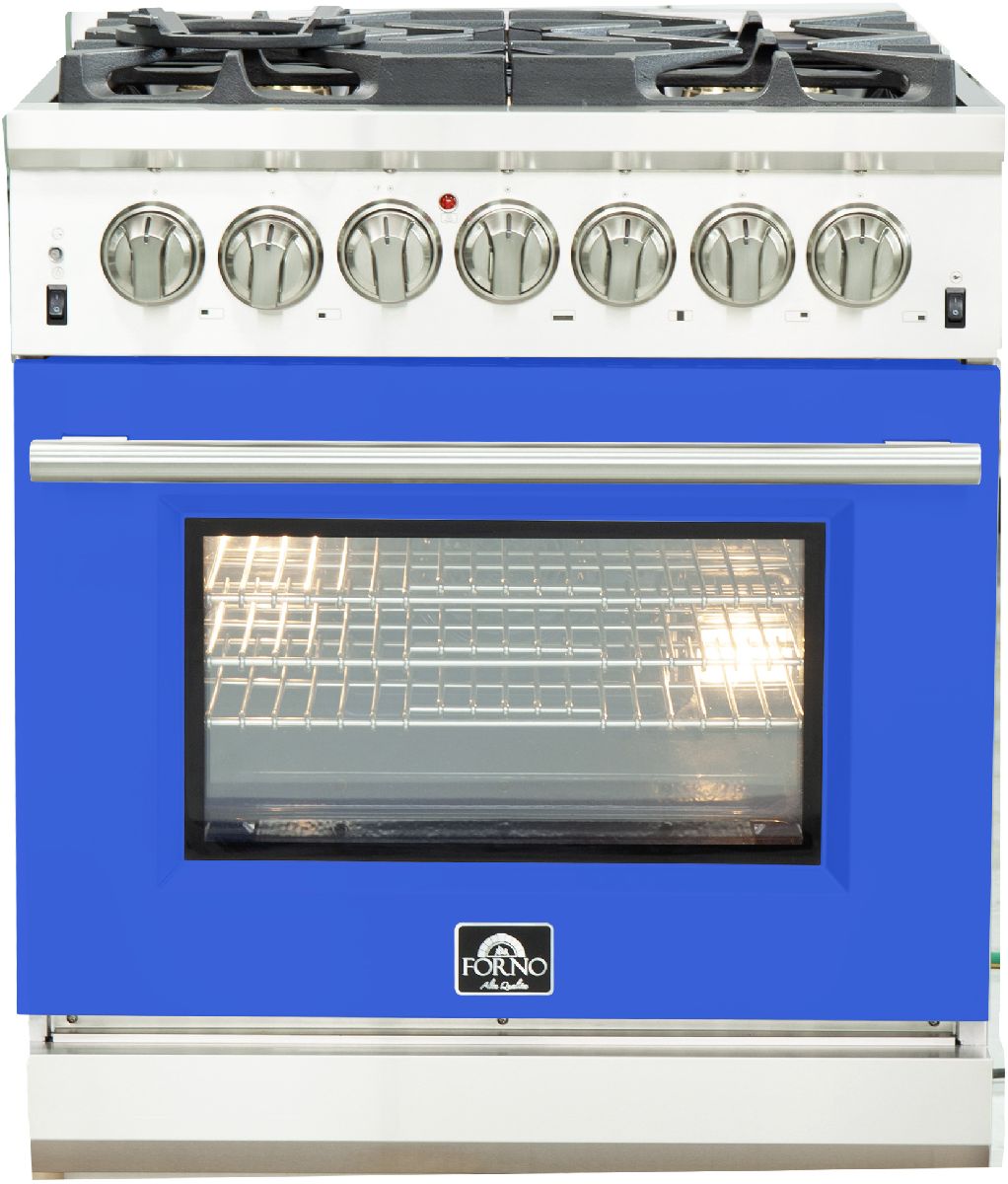The Forno 30 Inch Capriasca Dual Fuel Range brings professional styling and Performance into your home kitchen with its durable and beatiful 304 grade stainless-steel design. Cooking surface has 5 sealed dual-ring brass burners with a total output of 100,000 BTU. 20K dual-ring burner for boiling or searing and is able to perform simmering like melting chocolate or sauces, Continuous heavy-duty cast-iron grates allow for easily sliding pots or pans off heat when desired. This 4.32 cu. ft. true convection fan oven has an impressive blue enamel interior, allowing for easy cleaning. The 3-layer glass oven door window provides both heat retention and an unobstructed view. This oven also boasts a total output of 6,300 Watts, providing plenty of power for baking, roasting, and broiling. Included are 3 fully telescopic easy access stainless steel oven racks, concave Wok Ring and LP conversion kit. Additionally, zinc coated metal knobs with bezel rings will maintain their beauty for years.Read More