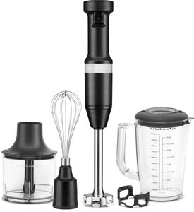 This KitchenAid® Variable Speed Corded Hand Blender features an 8" removable blending arm with 4-point stainless steel blade to blend everything from smoothies, to milk shakes, soups, sauces and so much more. It is easy to use with the variable speed trigger switch and includes a US patented removal pan guard to help protect your cookware. The 4-Cup BPA-Free Blending Jar with lid is great for individual blending jobs, and can be used to serve direct from or to store your blended creation for a later use. In addition, this model includes a whisk attachment, great for whipping egg whites to fluffy peaks, and also a chopper attachment that quickly and easily chops fresh ingredients.Read More