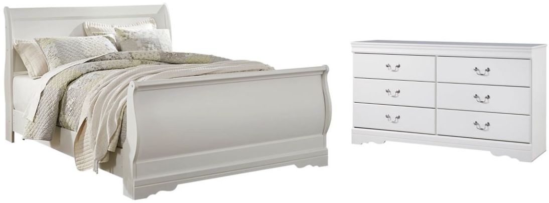 Includes sleigh bed (with headboard, footboard and rails) and dresser