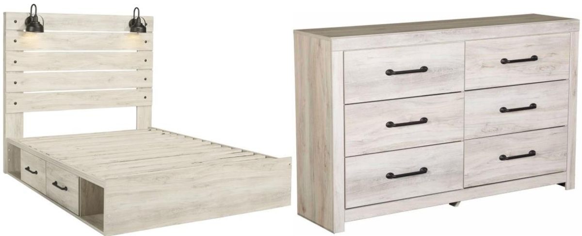 Includes panel storage bed (headboard, footboard, side storage, rails and slats) and dresser
