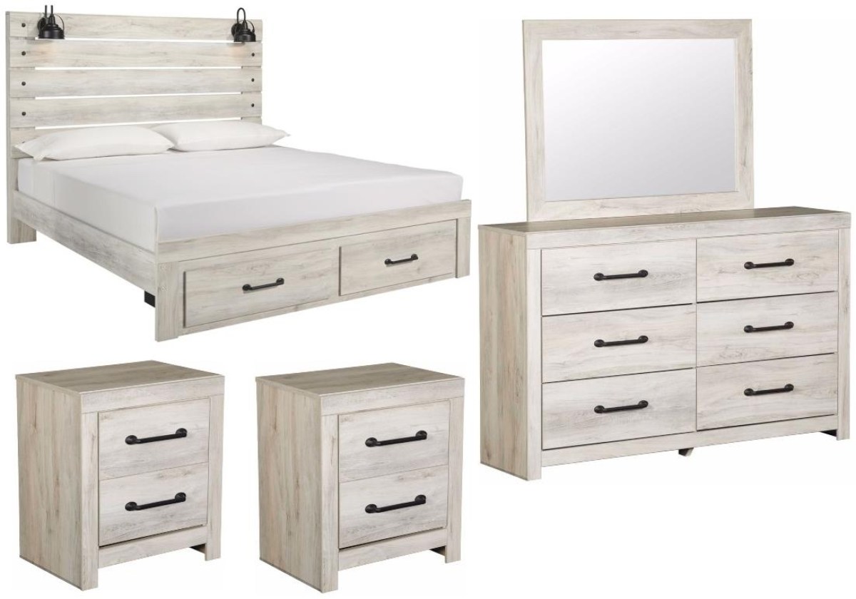Includes panel bed with storage (headboard, footboard and rails), 6-drawer dresser with mirror, and two 2-drawer nightstands