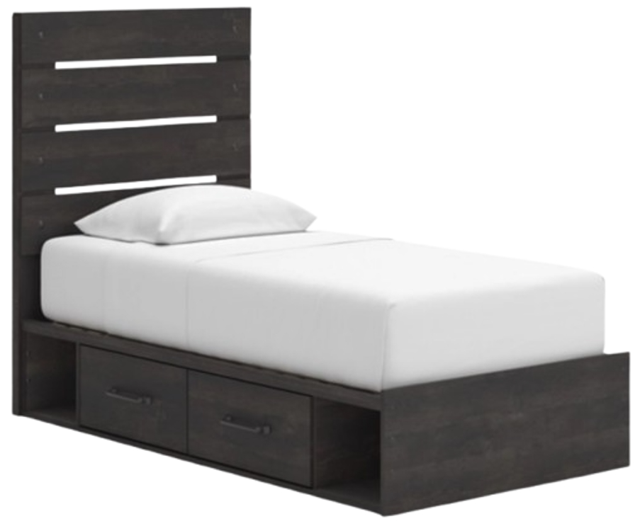 This twin panel bed with storage puts a casually chic twist on everyday function. Its rustic charcoal finish pairs well with other neutrals and pops of color alike, giving you the flexibility to change up your aesthetic as you please. Smooth-gliding drawers discreetly tuck away clutter without taking up extra floorspace.Read More