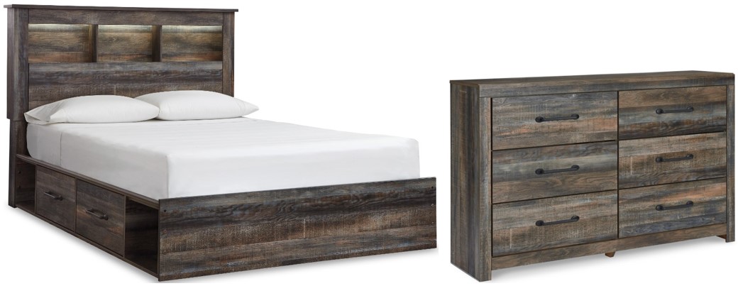 This full-size bookcase bed with storage and dresser is a refined take on barn board beauty. The dresser with six smooth-gliding drawers lined with faux linen laminate and industrial dark-tone hardware complete this rustic and industrial style bedroom. Mattress and foundation/box spring available, sold separately.