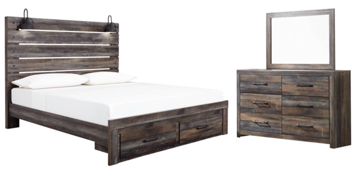 Includes king-size panel bed (headboard, 2-drawer storage footboard and rails) and 6-drawer dresser with mirror