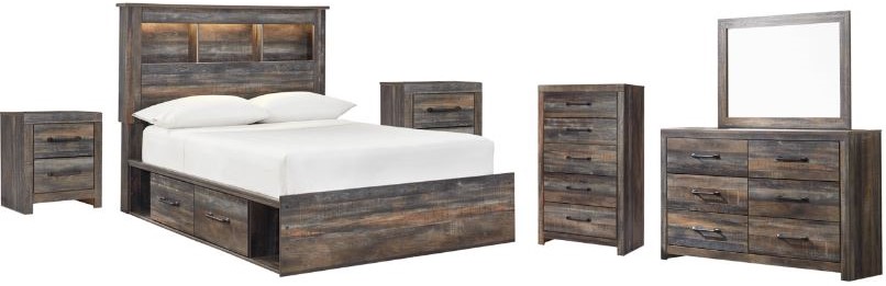 Includes full-size bookcase bed with storage (bookcase headboard, footboard, underbed storage, rails and wood roll slats), 6-drawer dresser with mirror, 5-drawer chest and two 2-drawer nightstands