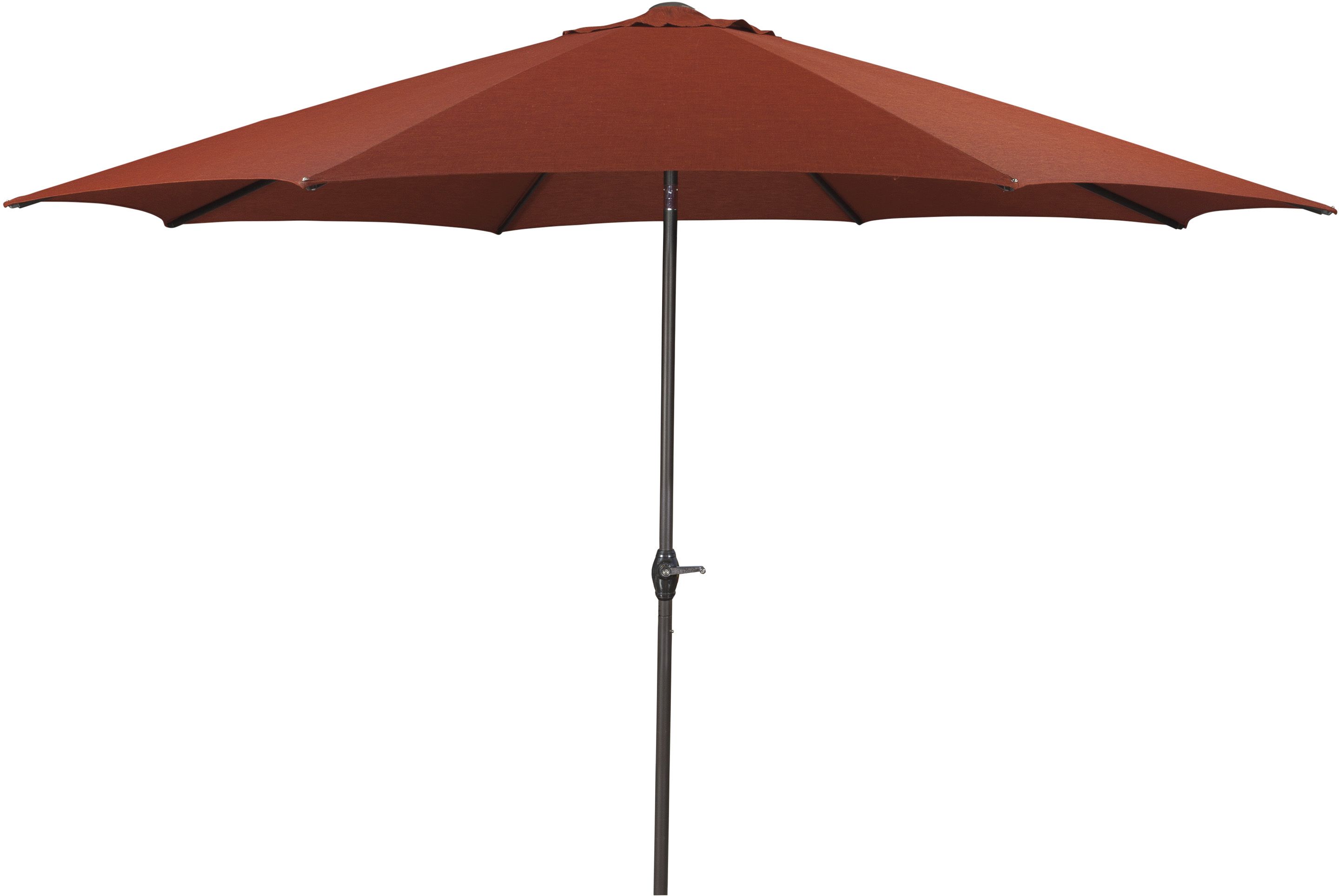 With the 11' octagonal patio umbrella set, a burnt orange canopy and dark brown tilting frame shade you from the sun all day. High-performing Nuvella™ canopy blocks out harmful UV rays, while the easy auto tilt frame follows the arc of the sun. A smooth hand crank opens and closes the umbrella. Umbrella base sold separately.