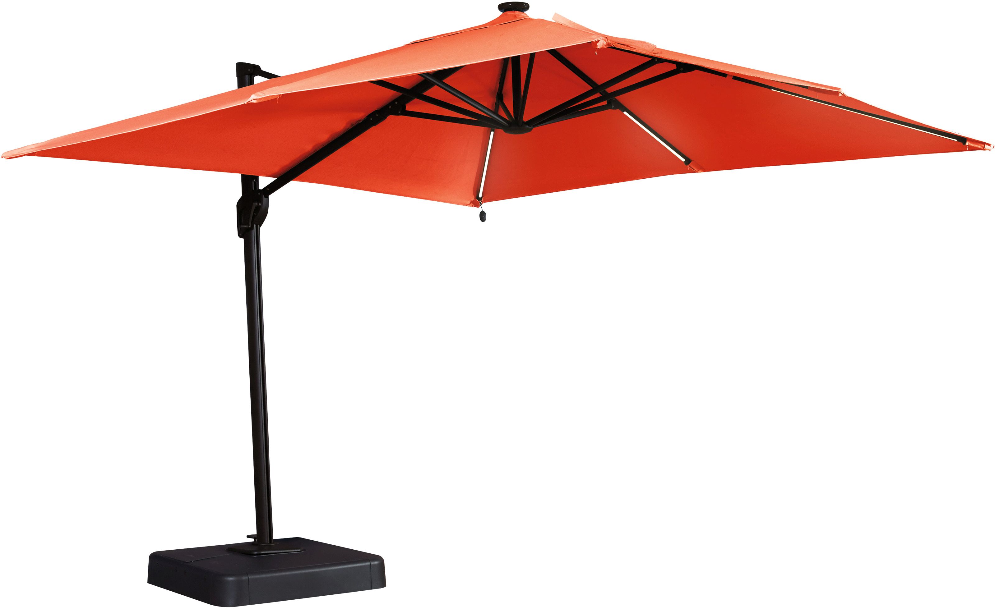 Aluminum frame and pole. LED lights with on/off switch. Many convenient vertical positions. Molded resin base includes foot pedal release for 360 degree motion to cover a large area. Solar panel LED light system with AC/DC adapter included. All umbrellas have high performance Nuvella fabric. P017-990 coral. P017-993 burnt orange. P017-995 linen/brown. Aluminum frame and pole. LED lights with on/off switch. Molded resin base. All have vertical positions plus can rotate 360 degrees. P017-993 is 10ft square; P017-995 is 11ft octagonal.