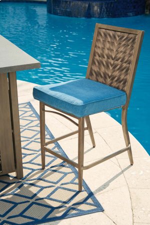 The Partanna cool blue barstool seat cushion is made from Nuvella™ fabric for fade and stain-resistance and easy maintenance.